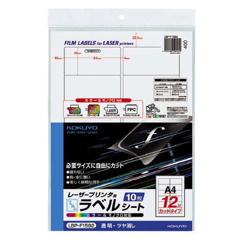 カラーLBP&コピー用フィルムラベル 10枚入 12面カット 透明 ツヤ消し