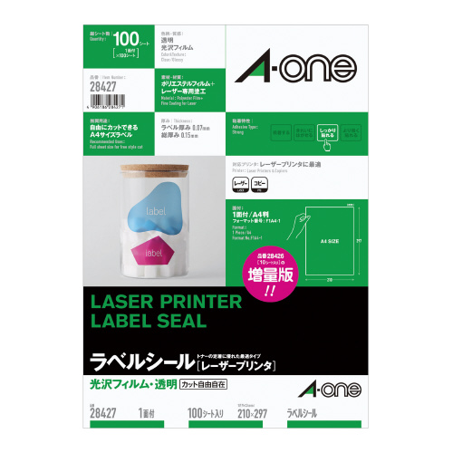 レーザープリンタ用ラベルシール 光沢フィルム・透明 ノーカット 100枚