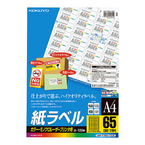 LBP用紙ラベル カラー&モノクロ対応 A4 100枚入 65面カット
