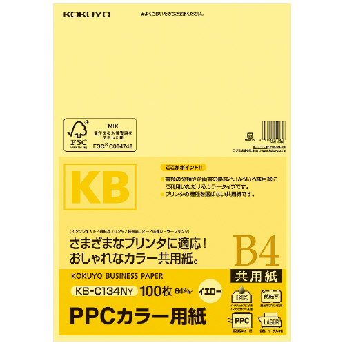 PPCカラー用紙(共用紙) FSC認証 B4 100枚 64g平米 黄