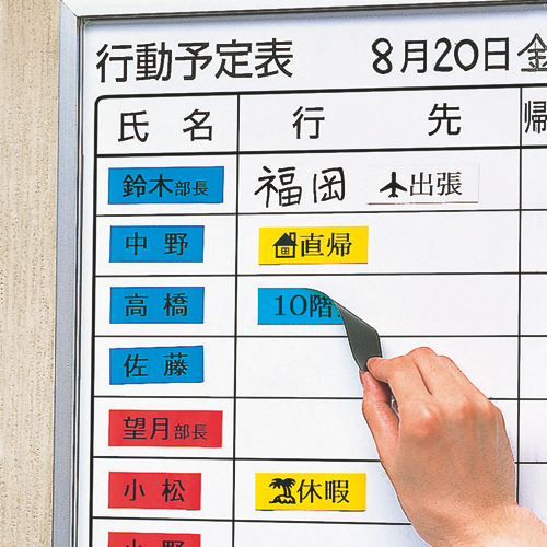 ●ホワイトボードやスチール什器などに、繰り返し貼ってはがせるマグネットテープは頻繁に変化する状況の表示に効果的です。