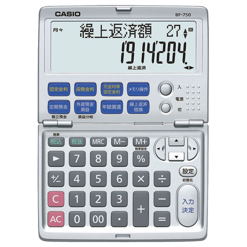 ●「繰上げ返済計算」や「借換計算」機能を搭載、複雑なローン計算も簡単シュミレーションできる金融電卓 ●計算状態表示 ●大型画面漢字表示7文字+12桁 ●繰上返済計算 ●借換計算 ●元金均等ローン計算(固定金利) ●元利均等ローン計算(固定金利・段階金利) ●定期預金計算(元利合計・元金) ●積立預金計算(元利合計・元金) ●外貨預金計算(損益計算・損益分岐計算) ●年賦償還計算 ●サイズ:162.5×118×8.3mm(開時) ●質量:約115g ●電池:CR-2025×1 ●折りたたみ手帳タイプ ●早打ち対応