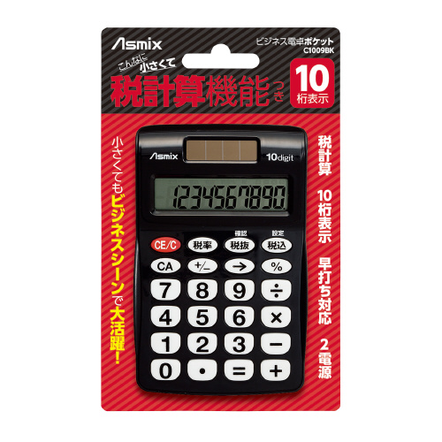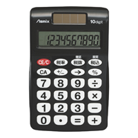 ●10桁 ●使用電源:太陽電池+アルカリボタン電池(LR1130)1個 ●保証期間:1年間 ●付属品:取扱説明書、保証書 ●本体寸法:W70×D112×H19mm ●本体質量:約45g ●税計算 ●桁下げ(→)キー ●早打ち対応 ●%キー ●±キー ●オートパワーオフ機能 ●表示部傾斜 ●ゴムキー ●すべり止め付き