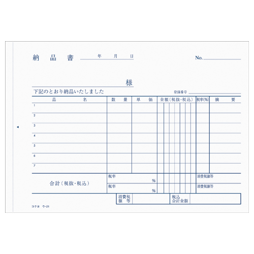複写簿(カーボン紙必要) 納品書 B6横 7行 50組 ウ-21N