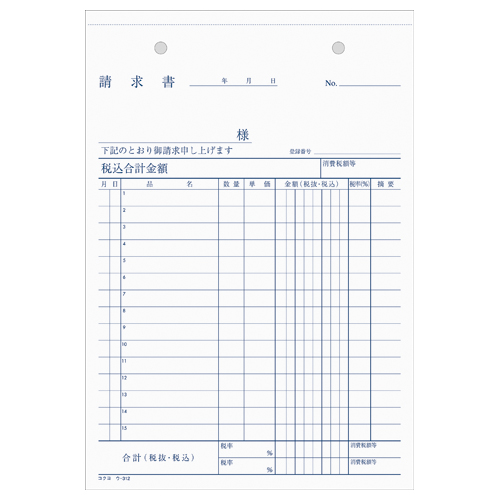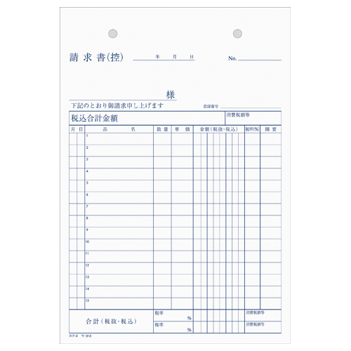 NC複写簿 請求書 A5縦 2穴80mmピッチ15行 50組 ウ-312