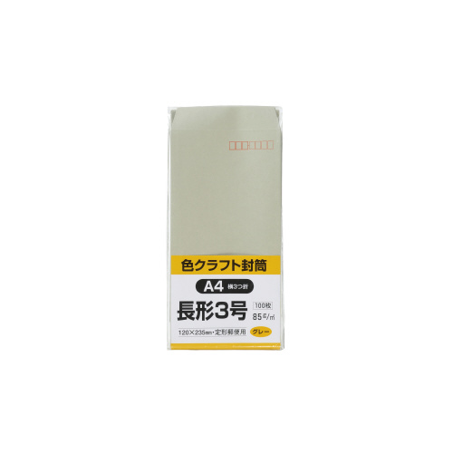 ●鮮やかなカラークラフト封筒 ●中身が透けにくく、個人情報保護にも安心 ●長形3号 ●サイズ/120×235mm ●グレー ●紙厚85g/平方メートル ●100枚入り ●〒枠付 ●サイド貼り ●古紙配合紙