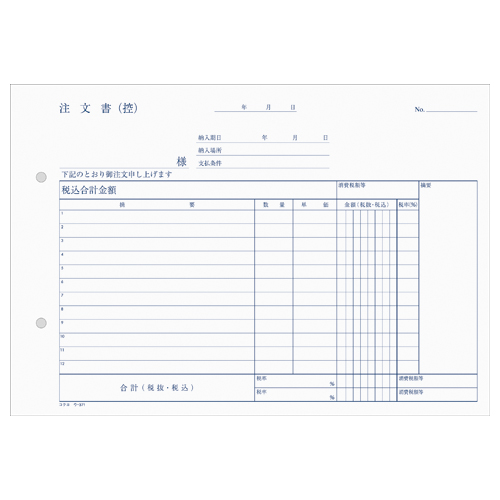 NC複写簿 3枚注文書(注文請書付) B5横 2穴80mmピッチ12行 40組 ウ-371