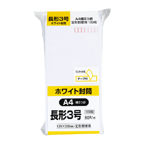 ●長形3号 ●サイズ/120×235mm ●紙厚80g/平方メートル ●100枚入り ●テープ付 ●〒枠付 ●センター貼り●紙質/白封筒用紙(ケント)