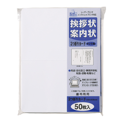 ●プリンター対応挨拶状案内状カード ●二つ折りカード ●サイズ/206×155mm ●紙厚260g/平方メートル ●50枚入り ●FSC認証紙 ●紙質/上質紙