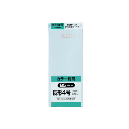 ●長形4号 ●サイズ/90×205mm ●ブルー ●紙厚80g/平方メートル ●100枚入り ●〒枠付 ●サイド貼り ●古紙配合紙