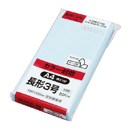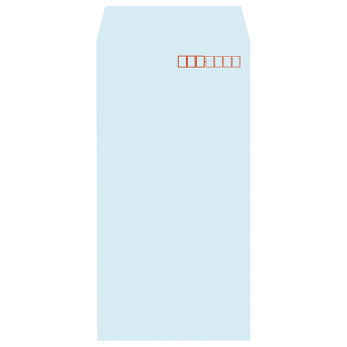 ●長形3号 ●サイズ/120×235mm ●ブルー ●紙厚80g/平方メートル ●50枚入り ●テープ付 ●〒枠付 ●サイド貼り ●古紙配合紙