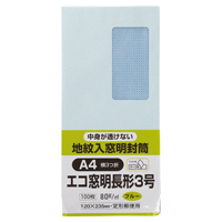 ●中身が透けない裏地紋入り窓付き封筒 ●窓部は分別せずに処分できる環境対応のグラシン紙を使用 ●長形3号 ●サイズ/120×235mm ●ブルー ●紙厚80g/平方メートル ●100枚入り ●テープ付 ●マド寸法/45×90mm ●センター貼り ●古紙配合紙 ●窓/グラシン紙