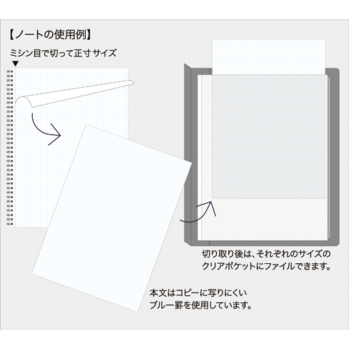 ●コピーに写りにくいブルー罫で、プランニング用・デザイン用・統計用紙などに最適です。ミシン目をカットすれば正寸サイズなので、クリアポケットに収まります。