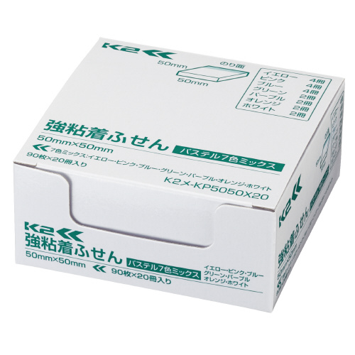 強粘着ふせんK2 50×50 20冊 ミニ正方形サイズ(パステル7色ミックス) K2メ-KP5050X20