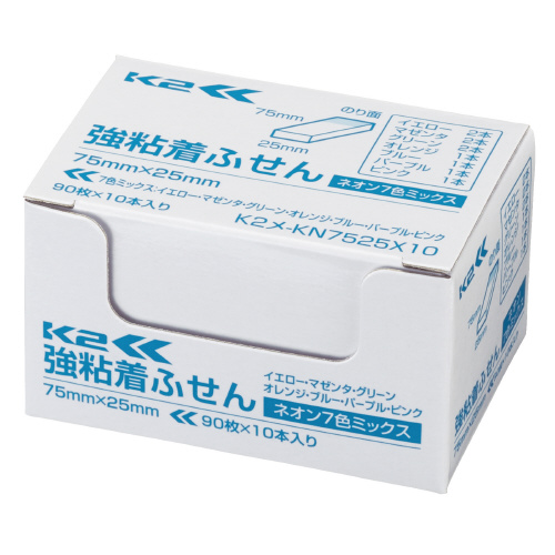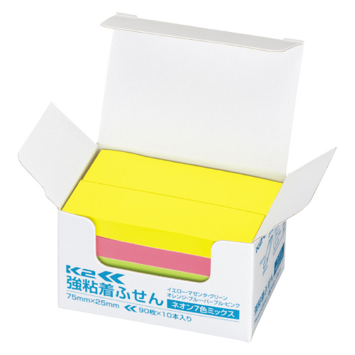 強粘着ふせんK2 75×25 10本 レギュラーサイズ(ネオン7色ミックス) K2メ-KN7525X10