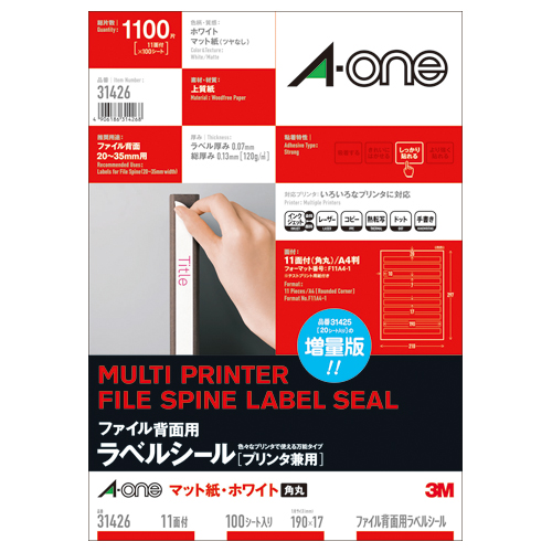 エーワンプリンタ兼用ラベル マット紙 ファイル背面用ラベルシール11面100枚