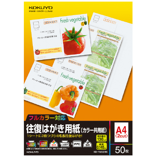 往復はがき用紙(カラー共用紙) A4/2面 50枚 郵便番号枠あり