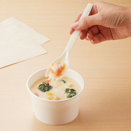 ●汁物もこぼれにくいラミネート加工のカップ。スープ以外に、デザートやサラダにも!