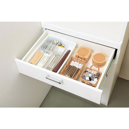 ●引き出し内をすっきり整頓できるカトラリートレー。スライド式なので、高さも有効に使うことができます。