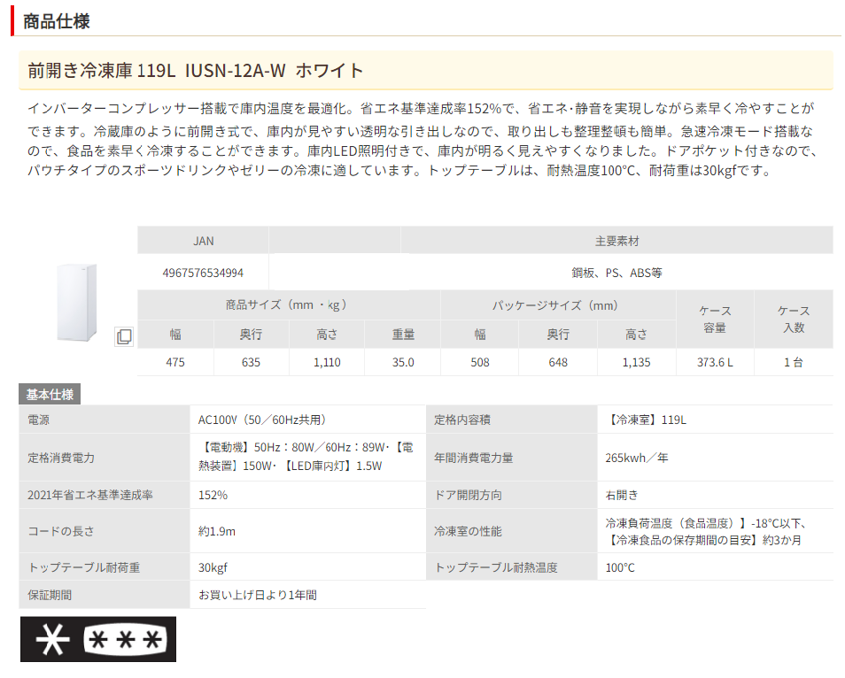 前開き冷凍庫 119L IUSN-12A-W ホワイト