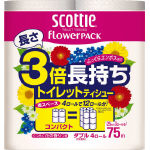 トイレットペーパー●ダブル●ロール幅/114mm●芯・ミシン目あり●75m巻き×4ロール●くつろぐ花の香りつき●原料/パルプ+紙パックリサイクルパルプ●4ロールで12ロール分の長さ(スコッティフラワーパック12Rダブルとの比較)だから、取替えの手間削減や保管スペースの削減にもなります。●クレシア独自のふっくらエンボス加工で、やわらかくコンパクトな長尺ロール。