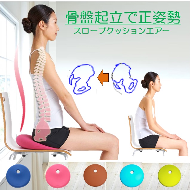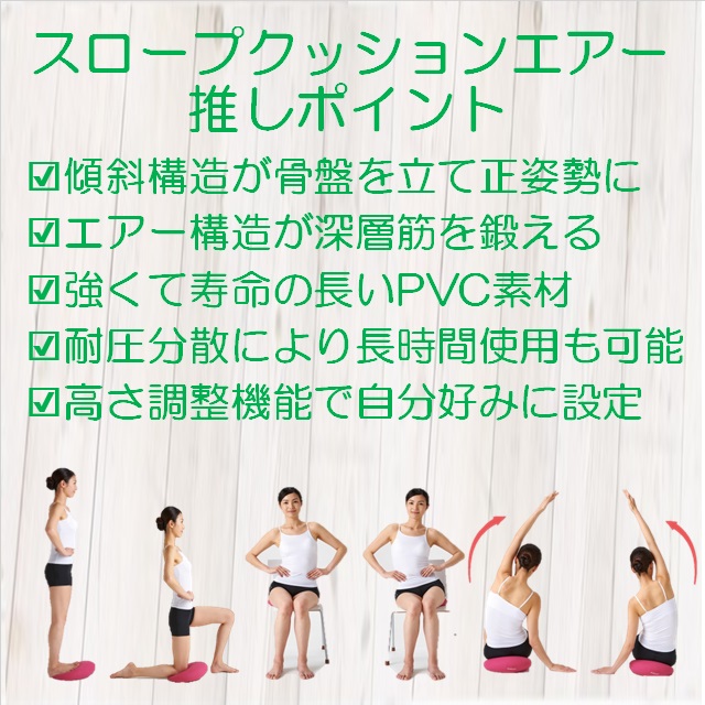 今まで発売されている椅子上の矯正椅子やマットの多くが使用しているときだけの「骨盤矯正」や「体圧分散」や「姿勢を矯正」などが殆どで、根本的な悩み解決は図られていません。その理由は歪んだ骨格が座っているときだけ正しい位置に戻ったとしても周囲の歪んでガチガチ筋力はそのままでは骨格歪矯正されません。必ず周囲筋の柔軟性づくりが大切で「動かして解して正しく戻す」の実行が必要です。椅子に置いて使用できる「スロープクッションエア」は、傾斜構造で骨盤を起こしエアーがインナーマッスルを鍛えます。「ながら運動」で体の骨格と筋力を解し、バランスの良い体づくりをサポートしてくれます。独自開発の「スロープエアークッション」はオフィスでもお家でも腰・骨盤を優しく包みます。中が空気なのでお一人お一人の腰の形状にフィットした心地よい厚さに調節可能。インナーマッスルの微細な運動も促し、腰や背骨を正しく戻す筋肉をつくる手助けをします。長時間座りっぱなしの人や腰の悩みや姿勢が気になる方におすすめです。