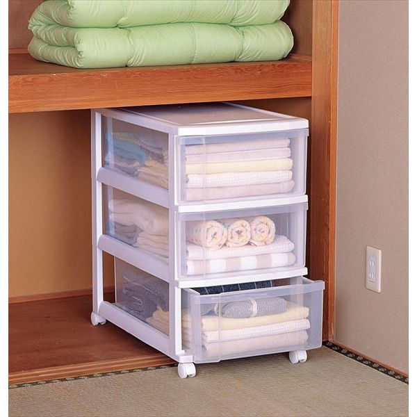 商品の説明色:ホワイト/クリア[商品スペック]●サイズ(mm) : W390×D650×H680●重量(g) : 5074●主要材質 : ポリプロピレン●引出内寸(約) : 320×608×178mm●収納の目安 : セーターなら4枚、バスタオルなら6枚●原産国 : 日本[商品詳細]押入れ収納に最適なサイズのチェストです。一般的な押入れなら横に2個並べて収まります。着脱簡単フレームなので、引出しを減らすことが可能です。移動に便利なキャスター付きです。