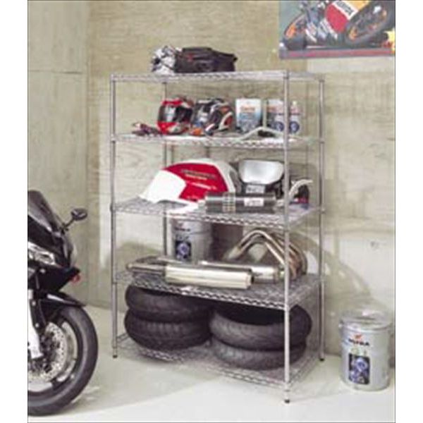 ・棚板:5枚・ポール直径:25mm・耐荷重・棚板1枚当たり約125kg、全体約500kg・材質・棚板・ポール:スチール(クロームメッキ仕上げ)・棚板固定部品:ABS樹脂