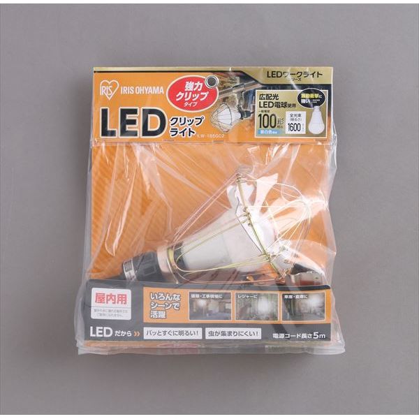 商品の説明スタイル:1600lmLED電球を採用した屋内用クリップライトです。消費電力が白熱電球比で約1/9と少なく、省エネで長寿命(約40000時間)です。強力クリップでどんな場所でも挟んで使え、取り付け角度も自在に調節できます。LED電球は、白熱球に比べて振動や衝撃に強い構造です。高い耐久性が求められる作業現場などのシーンに最適! 連結ソケット付きなので、電源1つで複数連結が可能です。