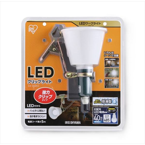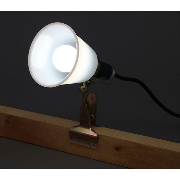 商品の説明スタイル:485ルーメンLED電球を採用した作業用クリップライト。屋外でも使える防滴型(IP32)です。消費電力が白熱電球比で約1/9と少なく、省エネで長寿命(約40000時間)! ライトをしっかり支えるクリップがついているので、ポールや板などを挟んで使えます。ライトの角度は、自在に調節できます。LED電球は、白熱球に比べて振動や衝撃に強く、高い耐久性が求められる作業現場などのシーンに適しています。