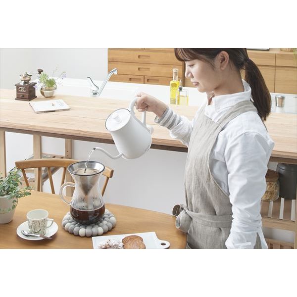 商品の説明安らぎのティータイムでほっと一息。インテリアにも馴染むアンティーク調のデザインの電気ケトルです。置いているだけで空間がオシャレに。スイッチひとつで沸かせる簡単操作。欲しい時にすぐに沸くので、時間がないときにも重宝します。水を入れてスイッチON!沸いたら自動でスイッチOFF!【細口ノズルで注ぎ自由自在】注ぐお湯の量や速度をコントロールしやすく、コーヒーや紅茶を淹れるのに最適です。【一目でわかる満水容量】本体の内側には満水容量がわかる「MAX/0.6L」の表示付き。水の入れすぎを防ぎ、注ぎ口からお湯が吹きこぼれる心配もありません。【安全機能つきで安心】・自動電源OFF機能お湯が沸くと電源レバーが上がり、電源ランプが消灯します。そばにいなくても大丈夫だから、時間を有効に使えます。・空だき防止機能容器内が空のまま電源を入れると、空だき防止機能が働いて、自動的に電源が切れます。【便利なコードホルダー付き】3箇所のゴム脚付きで滑りにくい!コードを収納でき、長さを調整できるから邪魔にならず便利。【お手入れラクラク】広口でふたの取り外しが可能だから、お手入れがしやすい。