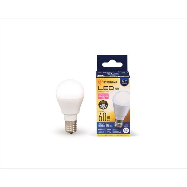 商品の説明サイズ:3)60W?|?スタイル名:1)1個?|?色:1)昼白色白熱電球のように光が広がる、広配光タイプのLED電球です。リビングやダイニングなどの照明に最適です。口金サイズがE17なので、照明器具を替えることなく使用できます。光色はバランスが取れた明るさで過ごしやすい空間を演出する「昼白色相当」と温かみのある「電球色相当」の2種類です。5年保証で長寿命約40000時間の、ランプ交換の手間が少ないLED電球です。また、省エネで電気代も節約できます。密閉形器具対応。ダウンライトなどの断熱材施工器具対応。※器具の種類によって、寸法が合わない、熱がこもる等の要因により、使用できなかったり、寿命が短くなる場合があります。※調光(明るさを調整できる)機能の付いた器具には使用できません。★LED電球の特長★・水銀レス:環境に有害な水銀を含みません。・すぐに明るく:スイッチを入れた瞬間に明るく点灯します。・虫が集まりにくい:虫が集まりやすい紫外線領域波長をほとんど出さず、灯具清掃の手間を軽減できます。・ON/OFFに強い:スイッチを頻繁にON/OFFしても劣化せず、寿命が短くなりません。・低UV/低赤外線:紫外線や赤外線をほとんど出さないので、紫外線による色あせや赤外線による熱が気になりません。●商品サイズ(cm):直径約3.8×高さ約7.5●商品重量:約53g●口金サイズ:E17●光色相当:昼白色相当●型番:LDA6NGE176T7●定格消費電力:5.9W●定格入力電流:0.11A●全光束:760lm●配光角:約180°●設計寿命:約40000時間●電源:100V(50/60Hz共用)●使用場所:屋内用●ランプ全体の明るさ:小形電球60形相当●エネルギー消費効率:128.8lm/W●断熱材施工器具:○●密閉形器具:○※密閉形器具の種類によって、寸法が合わない、熱がこもる等の要因により、使用できなかったり、寿命が短くなる場合があります。