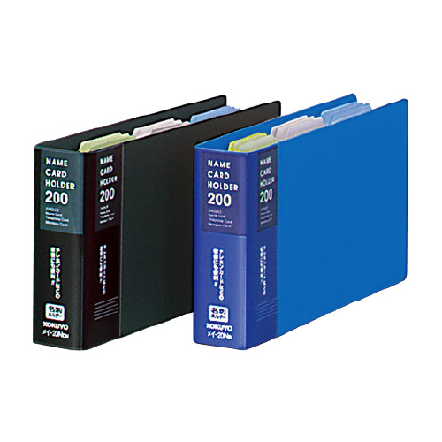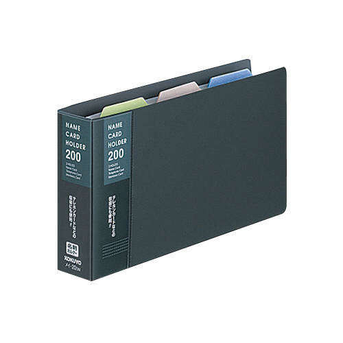 ●名刺以外のカード類の収容にも便利。●収容できる台紙枚数34枚(最大収容枚数約44枚)●3色の見出しカードは色別に分類または業種・部署別などのタイトル書きに使用できます。●替紙式●PP表紙●サイズ/110×206×35mm●替背紙式●タテ入れ●2穴(54mmピッチ)●収容可能寸法/93×57mm●中芯あり