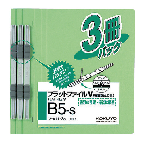 フラットファイルV(樹脂製とじ具)3冊 B5縦 15mm 緑 フ-V11-3G