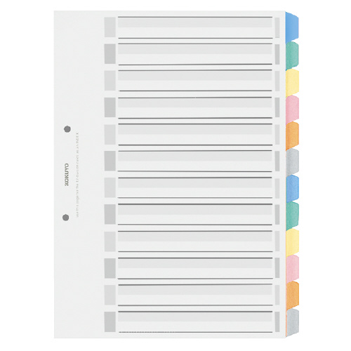 カラー仕切カード<PP>(ファイル用) A4縦 12山+扉紙 2穴 5組入 シキ-P100