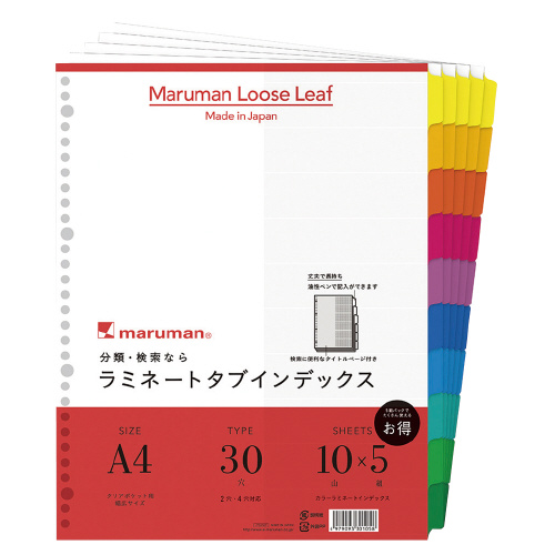 ●A4タテ ●サイズ/297×232(+9.5)mm ※( )内は山高さ ●1組/10山:10色10山見出し+扉紙 ●穴数/30穴 ●5組入 ●古紙パルプ配合