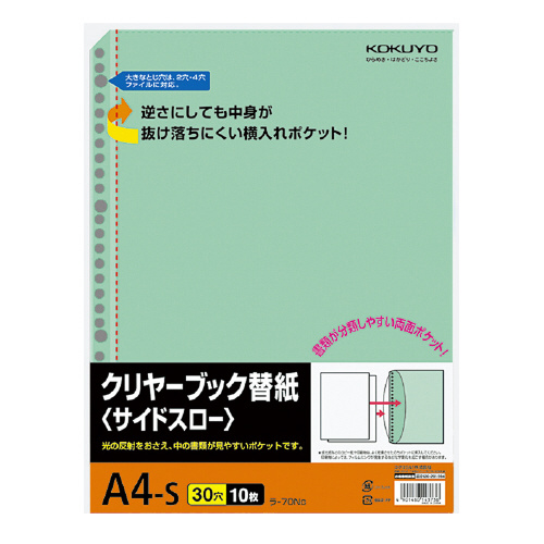 クリヤーブック替紙(サイドスロー) A4縦 30穴 台紙色緑 10枚入 ラ-70NG