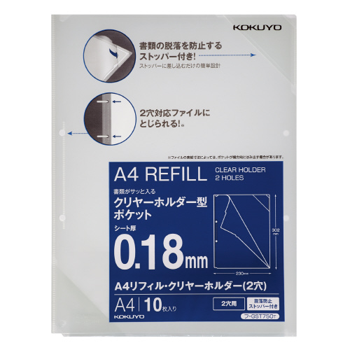 A4リフィル・クリヤーホルダー 2穴A4脱落防止ストッパー付き10枚 フ-GST750T