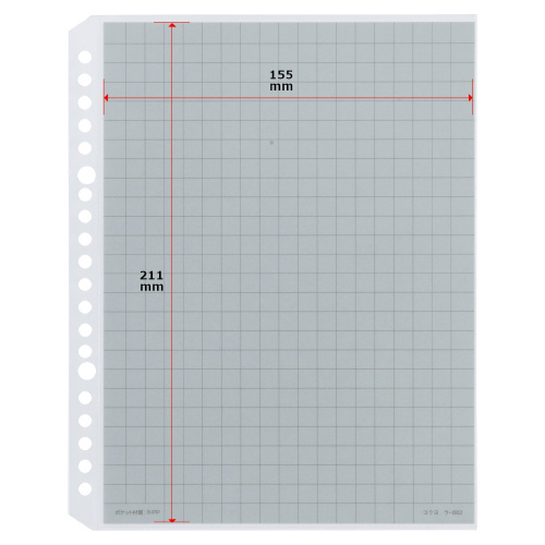 ●エンボス仕上げで光が反射せず、書類が見やすいポケット。多穴・丸穴。エンボス仕上げだから、光が反射せず目にも優しいタイプです。●ポケット内寸/211×155mm●ポケット仕様/エンボス仕上げ・中紙あり●サイズ/215×170mm●2・20穴●グレー8mm方眼罫入り●再生PP●適用品番/コクヨクリヤーブック(ラ-722N)