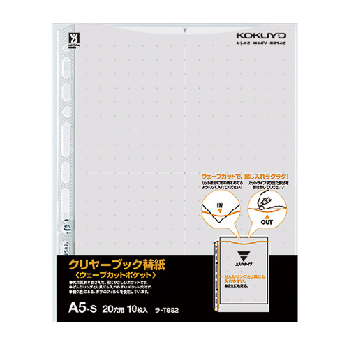 ●穴が大きく穴数が少ない連結とじ穴を採用しているので、とじ具に通しやすくなりました。●ポケット内寸/211×158mm●ポケット仕様/ウェーブカット・つや消し仕上げ・中紙あり●サイズ/215×172mm●穴数/2・20穴対応●適用商品/ラ-T722他●中紙あり●再生PP●ユニバーサルデザイン