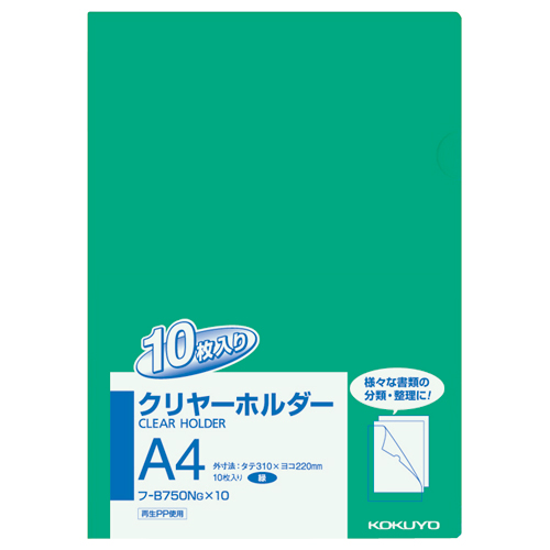 クリヤーホルダー(10枚パック) A4 緑 フ-B750NGX10