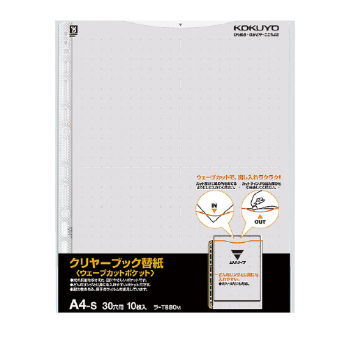 ●穴が大きく穴数が少ない連結とじ穴を採用しているので、とじ具に通しやすくなりました。●ポケット内寸/298×217mm●ポケット仕様/ウェーブカット・つや消し仕上げ・中紙あり●サイズ/302×231mm●穴数/2・4・30穴対応●適用商品/ラ-T710他●中紙あり●再生PP●ユニバーサルデザイン