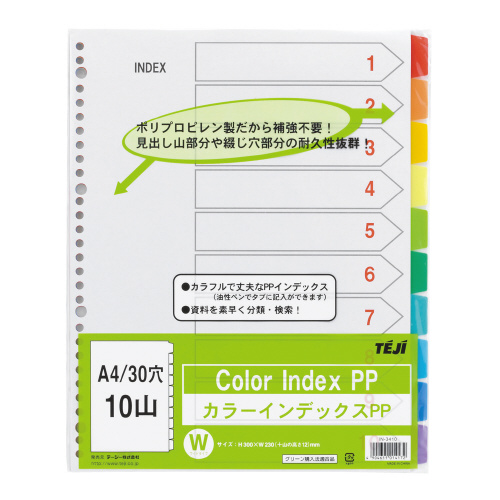 ●A4タテ ●サイズ/300×230(+12)mm ※( )は山高さ ●1組/10山:10色10山見出し+扉紙 ●穴数/30穴 ●1組入 ●再生PP