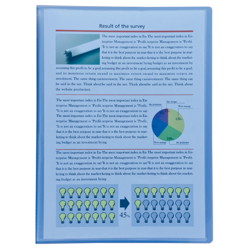 ●固定式 ●PP表紙(透明タイプ) ●サイズ/310×230×10mm ●ポケット/20枚 ●中紙なし ●エンボス仕上げポケット ●再生PP ●A4タテ ●色/ブルー